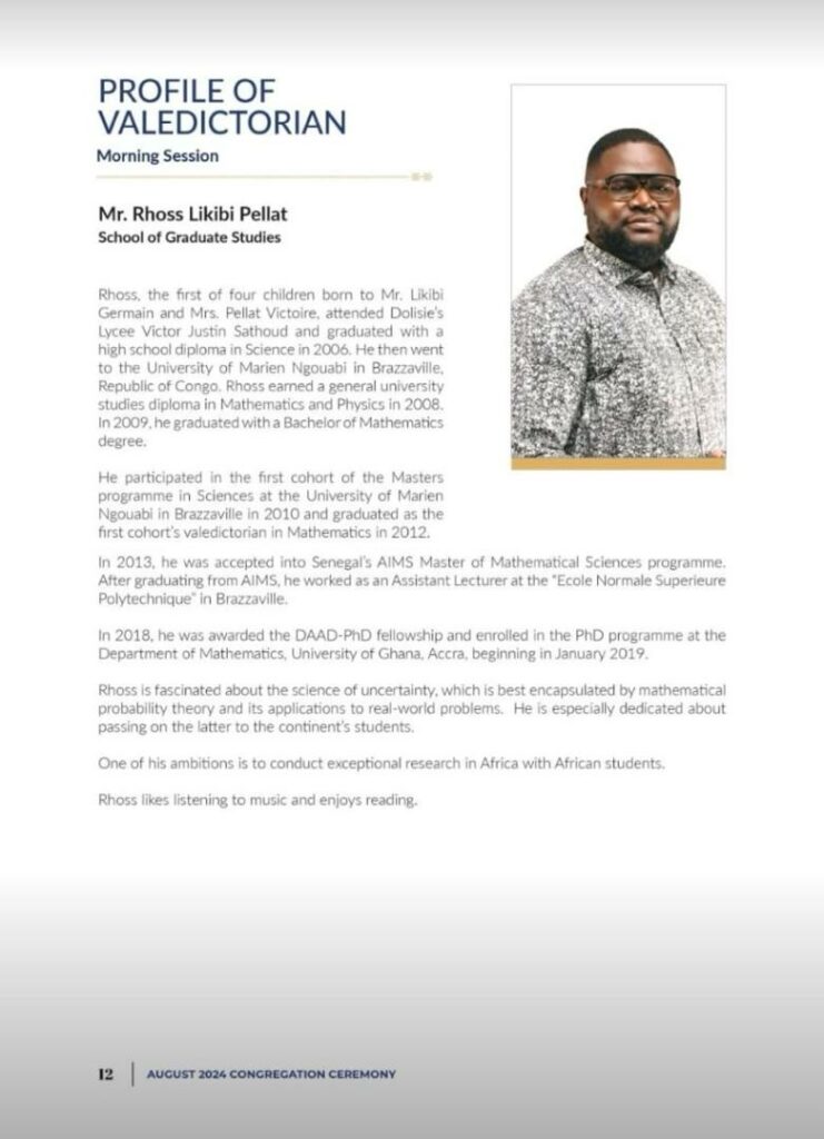 At the University of Ghana’s August 2024 Congregation Ceremony, Dr. Rhoss Likibi Pellat, a distinguished scholar from the AIMS Ghana Research Centre affiliated to the University of Ghana School of Graduate Studies, was celebrated as the valedictorian.