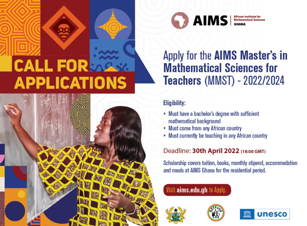 The African Institute for Mathematical Sciences (AIMS) Ghana invites applications for a two-year Master of Science in Mathematical Sciences for Teachers (MMST) program for the 2022/2023 academic year. This is a special training course for teachers of mathematics in Africa.