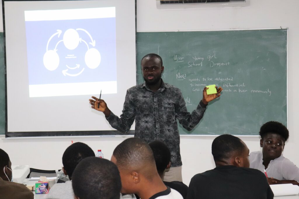 Design thinking is recognized as one of the most effective tools used for entrepreneurial strategizing purposes. In this regard, two days were allocated for this training session, facilitated by Design Thinking Ghana consisting of Mr. Bryan Achiampong and his team. It started with exposure to the “Power of Design Thinking in Exploring Entrepreneurship and Intrapreneurship in a Global Village”. The class was divided into eight groups. Each group was to critically examine the Sustainable Development Goals, identify a problem and provide business solutions. Students were trained on how to develop a ‘point of view’, which entails sampling an individual from the whole population facing the problem identified and addressing their specific needs.