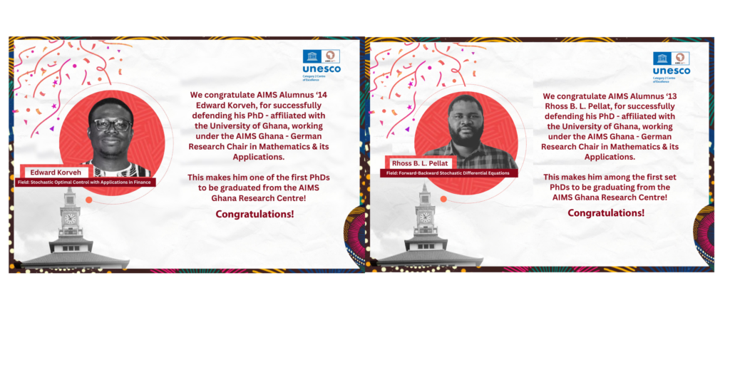 We are thrilled to announce and extend our heartfelt congratulations to Edward Korveh and Rhoss B. L. Pellat for their remarkable achievement in successfully defending their Ph.D. theses at the University of Ghana. Both scholars have demonstrated exceptional dedication and scholarly prowess while working under the African Institute for Mathematical Sciences (AIMS) Ghana-German Research Chair in Mathematics and its Applications. This achievement marks a historic milestone as Rhoss and Edward become the pioneer Ph.D. graduates from the AIMS Ghana Research Centre, underscoring the institution’s commitment to academic excellence and groundbreaking research.