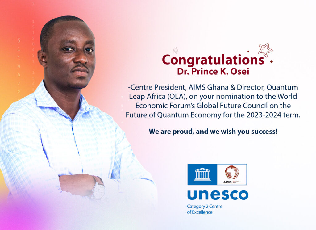 Dr. Prince K. Osei – Centre President, AIMS Ghana and Director, Quantum Leap Africa (QLA), has recently been nominated to the World Economic Forum’s Global Future Council on the Future of Quantum Economy for the 2023-2024 term. This is a great milestone and the Centre extends to him a hearty congratulations!