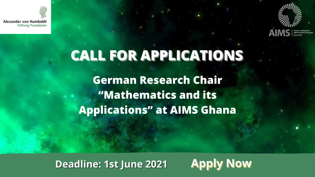 The Alexander von Humboldt Foundation is announcing a research chair, under the program financed by the Federal Ministry of Education and Research (BMBF) entitled “German Research Chairs”, at the African Institute for Mathematical Sciences (AIMS) in Accra, Ghana.